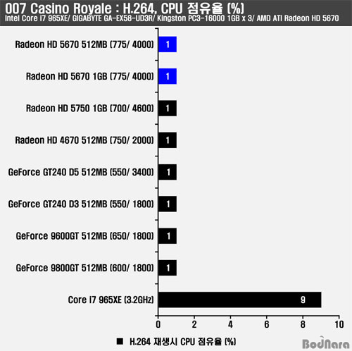 ÄÚ¾î i7 965XE (3.2GHz) CPU´Â 9%, ³ª¸ÓÁö GPUµéÀº °í¼º´É CPU¿Í Á¶Çսà H.264 Çϵå¿þ¾î °¡¼ÓÀ» ÅëÇØ 1-2% ³»¿ÜÀÇ ³·Àº CPU Á¡À¯À²À» Á¦°øÇÑ´Ù. ¶óµ¥¿Â HD 5670Àº HD ¿µ»ó Àç»ý½Ã ÄÚ¾î 400/ ¸Þ¸ð¸® 3600 (900)MHz·Î Á¶ÀýµÇ¾î µ¿À۵ǰí GT240Àº ÄÚ¾î 405/ ¸Þ¸ð¸® 324/ ½¦ÀÌ´õ 810MHz·Î ³·¾ÆÁø´Ù. °°Àº 40nm°¡ Àû¿ëµÇ´Â ¶óµ¥¿Â HD 5670 512MB´Â ÁöÆ÷½º GT240 GDDR5 (D5)ÀÌ 1W Á¤µµ ´õ ³ô°Ô ³ªÅ¸³ª°í GDDR3 ¹öÀüÀº 128W·Î 4W´õ ³·¾ÆÁ³´Ù.   ±×·¡ÇÈÄ«µå ¿Âµµºñ±³