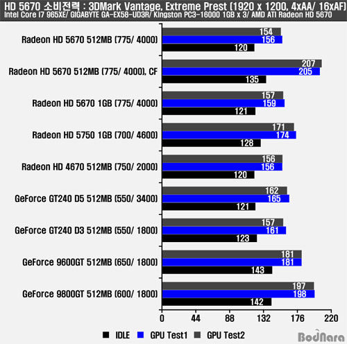 ¶óµ¥¿Â HD 5670 ¹× ºñ±³ ´ë»óÀÇ ±×·¡ÇÈÄ«µåµéÀÇ ¼ÒºñÀü·Â ÃøÁ¤Àº Àüü ½Ã½ºÅÛÀ» ±âÁØÀ¸·Î ÃøÁ¤µÇ¸ç, 3DMark Vantage Extreme Preset (1920 x 1200, 4xAA/ 16xAF)ÀÇ GPU Test1°ú GPU Test2 ÁøÇà½Ã °¡Àå ³ôÀº ¼ÒºñÀü·ÂÀ» ºñ±³Çß´Ù. ¶óµ¥¿Â HD 5670/ 5750Àº ¾ÆÀ̵é½Ã ÄÚ¾î 157/ ¸Þ¸ð¸® 1200 (300)MHz, ÁöÆ÷½º GT240Àº ÄÚ¾î 135/ ¸Þ¸ð¸® 135/ ½¦ÀÌ´õ 270MHz,  ÁöÆ÷½º 9600GT´Â ÄÚ¾î 650/ ¸Þ¸ð¸® 1800/ ½¦ÀÌ´õ 1625MHz·Î Ŭ·° °íÁ¤, 9800GT´Â ÄÚ¾î 300/ ¸Þ¸ð¸® 100/ ½¦ÀÌ´õ 600MHz·Î Ŭ·°ÀÌ ÀüȯµÇ¹Ç·Î ¾ÆÀ̵é½ÃÀÇ ¼ÒºñÀü·ÂÀº ÀÌ¿¡ µû¶ó ´Þ¶óÁø´Ù. ¶Ç, ¶óµ¥¿Â HD 5670Àº ¾ÆÀ̵é½Ã 14W/ ·Îµå½Ã 61W TDP, HD 5750Àº 16W/ 86W TDPÀÇ ½ºÆåÀ» Á¦°øÇϸç, HD 4670Àº 59W, ÁöÆ÷½º GT240Àº ¾ÆÀ̵é 9W/ ·Îµå½Ã 69W TDP, 9800GT´Â ·Îµå½Ã 105W, 9600GT´Â 65nm·Î 96W TDP ½ºÆåÀ» °¡Áø´Ù. ¶óµ¥¿Â HD 5670Àº ÁöÆ÷½º GT240°ú °°ÀÌ 40nm °øÁ¤ÀÌ Àû¿ëµÇ´Âµ¥ ¾ÆÀ̵é½Ã 2W ³»¿Ü, ·Îµå½Ã 5W Á¤µµ ´õ ³·Àº ¼ÒºñÀü·Â (GT240 GDDR5 ¹öÀü ±âÁØ, GDDR3´Â À̺¸´Ù Â÷À̰¡ ÁÙ¾îµë)À» Á¦°øÇÏ´Â °ÍÀ¸·Î ³ªÅ¸³ª Àü·ÂÈ¿À²ÀÌ ´õ ¶Ù¾î³ °ÍÀ¸·Î ³ªÅ¸³µ´Ù. ÁöÆ÷½º 9600GTÀÇ °æ¿ì 65nm G94 ÄÚ¾î ±â¹ÝÀÌ°í ¾ÆÀ̵é½Ã ÄÚ¾î °íÁ¤À¸·Î ¼ÒºñÀü·ÂÀÌ ³ô¾ÒÀ¸¸ç, ·Îµå½Ãµµ ¼º´ÉÀÌ ´õ ³ôÀº HD 5750º¸´Ù 7W Á¤µµ ´õ ³ôÀº ¼ÒºñÀü·ÂÀÌ ÃøÁ¤µÈ´Ù. |