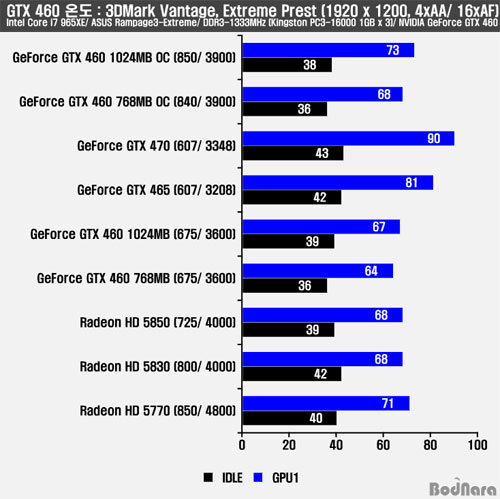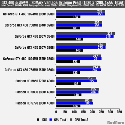 3DMark Vantage¸¦ µ¿ÀÛÇßÀ» ¶§ÀÇ ¿Âµµ´Â 768MB°¡ 68µµ, 1024MB´Â 73µµ¸¦ ±â·ÏÇßÀ¸¸ç, ¼ÒºñÀü·ÂÀº ¾ÆÀ̵é½Ã °¢°¢ 133/ 134W, GPU Test1¿¡¼´Â °¢°¢ 254W/ 271W, GPU Test2¿¡¼´Â 254W/ 270W¸¦ À¯ÁöÇß´Ù. ¼ÒºñÀü·ÂÀº ÁöÆ÷½º GTX 460 768MB´Â GPU Test1/2¿¡¼ 7/ 10W Áõ°¡ÇßÀ¸¸ç, 1024MB´Â 20/ 23W°¡ °¢°¢ Áõ°¡ÇÑ °ÍÀ¸·Î ³ªÅ¸³µ´Ù. ¿À¹öŬ·°½Ã ¹ß¿°ú ¼ÒºñÀü·ÂÀÌ Áõ°¡ÇÏ´Â ¸¸Å ÀÌ¿¡ ´ëÇÑ Ä𸵠ȯ°æÀ» ÃæºÐÈ÷ °í·ÁÇØÁà¾ß ÇÑ´Ù.