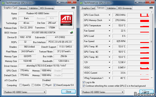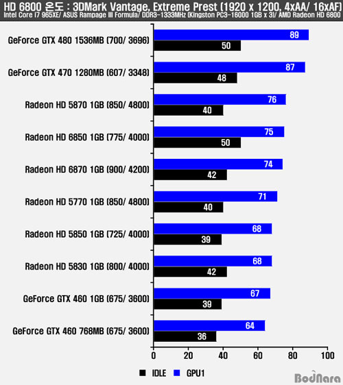 ¿Âµµ´Â ¶óµ¥¿Â HD 6800 ½Ã¸®Áî´Â CPU¿Í Ä𷯸¦ ¸ðµÎ Äð¸µÇÏ´Â ¹æ½ÄÀ̰í HD 6850Àº ÆÄ¿öÇ÷¹ÀÌ ¹ö±×·Î Ŭ·°ÀÌ ³ô¾Æ ¾ÆÀÌµé ¿Âµµ°¡ Á¶±Ý ´õ ³ôÀ¸¸ç, HD 6870°ú ºñ±³ÇØ ·Îµå »óȲ¿¡¼µµ ¿Âµµ°¡ ¾à°£ ´õ ³ô´Ù. (HD 6870 19/ 151W, HD 6850 19/ 127W, ÁöÆ÷½º GTX 460 768MB 150W/ GTX 460 1024MB 160W/ GTX 465 200W/ GTX 470 215W/ GTX 480 250W)