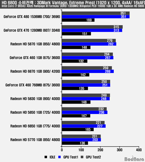 ÁöÆ÷½º GTX 460/ 470/ 480Àº ¾ÆÀ̵é½Ã ÄÚ¾î 50/ ½¦ÀÌ´õ 101.0/ ¸Þ¸ð¸® 270 (67.5)MHz·Î ³·¾ÆÁö¸ç, ¶óµ¥¿Â HD 5800/ HD 5700 ½Ã¸®Áî´Â ¾ÆÀ̵é½Ã ÄÚ¾î 157/ ¸Þ¸ð¸® 1200 (300)MHz·Î ³·¾ÆÁö°í, ¶óµ¥¿Â HD 6870Àº ¾ÆÀ̵é½Ã ÄÚ¾î 100/ ¸Þ¸ð¸® 324 (81)MHz·Î ³·¾ÆÁö°í ÆÄ¿öÇ÷¹ÀÌ ¹ö±×·Î HD 6850Àº ÄÚ¾î 250/ ¸Þ¸ð¸® 1080 (270)MHz·Î ³ô°Ô ³ªÅ¸³ª°í °øÁ¤Àº ¸ðµÎ 40nm·Î µ¿ÀÏÇÏ´Ù. TDP ½ºÆåÀº ÁöÆ÷½º GTX 460Àº 768MB°¡ 150W/ 1024MB°¡ 160W, GTX 465´Â 200W, GTX 470Àº 215W, GTX 480Àº 250W, GTX 260 (SP216) 182W, GTX 275 219W, GTX 285 183WÀ̸ç, ¶óµ¥¿Â HD 5850Àº ¾ÆÀ̵é 27W/ ·Îµå½Ã 151W, ¶óµ¥¿Â HD 5830Àº ¾ÆÀ̵é½Ã 25W/ ·Îµå½Ã 175W, HD 5770Àº ¾ÆÀ̵é 18W/ ·Îµå½Ã 108WÀÇ ½ºÆåÀ» °®°í HD 6870Àº ¾ÆÀ̵é 19W/ ·Îµå½Ã 151W, HD 6850Àº ¾ÆÀ̵é 19W/ ·Îµå½Ã 127W·Î Àü¹ÝÀûÀÎ TDP ½ºÆåÀº ÁöÆ÷½º GTX 400 ½Ã¸®Áî°¡ ³ô´Ù.