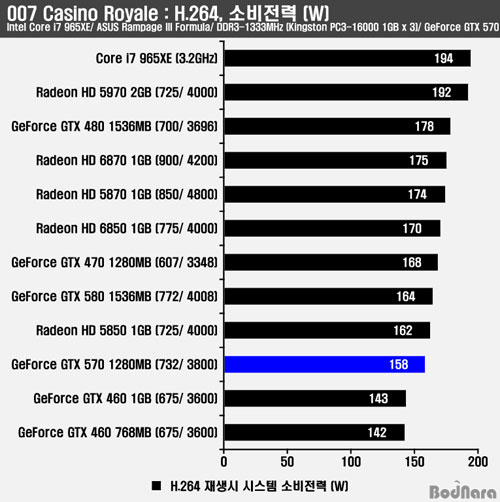HD ¿µ»ó Àç»ý½ÃÀÇ ¼ÒºñÀü·ÂÀº Àüü ½Ã½ºÅÛÀÇ ¼ÒºñÀü·ÂÀ¸·Î ÁöÆ÷½º GTX 570Àº ÁöÆ÷½º GTX 580°ú ÁöÆ÷½º GTX 480º¸´Ù Àü·ÂÈ¿À²ÀÌ °³¼±µÇ Á¶±Ý ´õ ³·Àº ¼ÒºñÀü·ÂÀ¸·Î µ¿À۵ȴÙ.