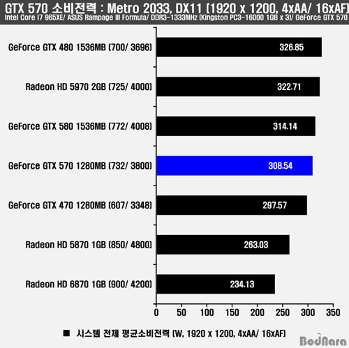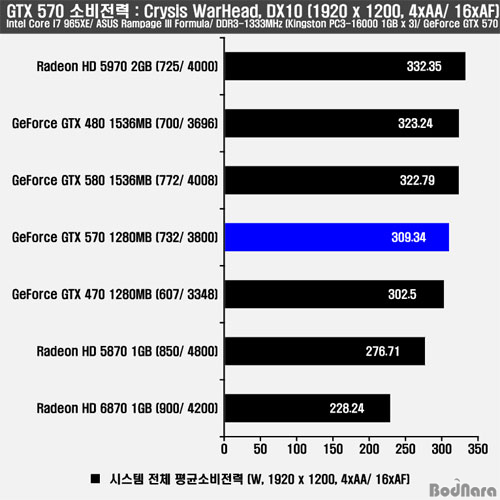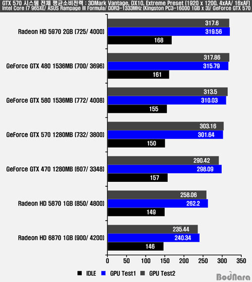 ÁöÆ÷½º GTX 570ÀÇ ½Ã½ºÅÛ Àüü Æò±Õ¼ÒºñÀü·ÂÀº ÁöÆ÷½º GTX 480/ GTX 580º¸´Ù´Â ÁöÆ÷½º GTX 470¿¡ º¸´Ù ±ÙÁ¢ÇÑ ¼ÒºñÀü·ÂÀ» Á¦°øÇÑ´Ù. ÁöÆ÷½º GTX 580°ú °°ÀÌ Àü·ÂÈ¿À² °³¼±À» ¹ÙÅÁÀ¸·Î ÁöÆ÷½º GTX 480º¸´Ù µ¿ÀÛŬ·°Àº ³ô¾ÆÁ³À¸³ª ½ÇÁ¦ ¼ÒºñÀü·ÂÀº ±Ù¼ÒÇÏ°Ô ³·¾ÆÁ® ¿ÍÆ®´ç ¼º´Éºñ°¡ °³¼±µÇ¾ú´Ù.