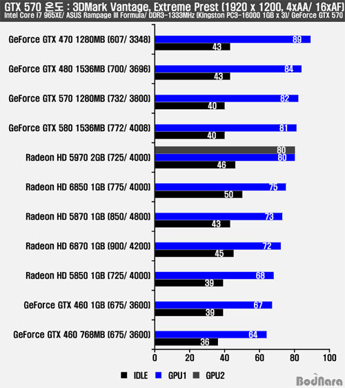 ¿Âµµ´Â °³¹æµÈ »óÅ¿¡¼ ÃøÁ¤ÇÏ¿´À¸¸ç, Ãß¿öÁø ³¯¾¾·Î Àü¹ÝÀûÀ¸·Î ³·¾ÆÁø ¿Âµµ¸¦ Á¦°øÇϴµ¥ ÁöÆ÷½º GTX 570Àº ÁöÆ÷½º GTX 480º¸´Ù ³·°í ÁöÆ÷½º GTX 580°ú °ÅÀÇ Â÷À̾ø´Â ¿Âµµ¸¦ Á¦°øÇÑ´Ù. ¼ÒÀ½ ¿ª½Ã µ¿ÀÏÇÑ ¹æ½ÄÀÇ »ç¿ëÀ¸·Î ÁöÆ÷½º GTX 580°ú Å« Â÷À̾ø´Â ¸ð½ÀÀ» º¸¿©ÁØ´Ù. (HD 6870 19/ 151W, HD 6850 19/ 127W, ÁöÆ÷½º GTX 460 768MB 150W/ GTX 460 1024MB 160W/ GTX 465 200W/ GTX 470 215W/ GTX 480 250W/ GTX 580 244W/ GTX 570 219W/ HD 5970 42/ 294W)