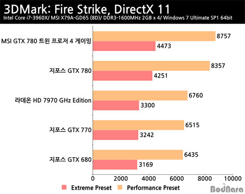 ´ÙÀÌ·ºÆ®X 11 ȯ°æ¿¡¼ÀÇ ¼º´ÉÀ» ÃøÁ¤ÇÒ ¼ö ÀÖ´Â ÆÄÀÌ¾î ½ºÆ®¶óÀÌÅ©(Fire Strike) Å×½ºÆ®¿¡¼ MSI GTX 780 Æ®À© ÇÁ·ÎÀú 4 °ÔÀ̹ÖÀº Å×½ºÆ® ´ë»ó Áß °¡Àå ³ôÀº ¼º´ÉÀ» º¸¿´À¸¸ç, ÀÌ´Â Extreme PresetÀ» ±âÁØÀ¸·Î ·¹ÆÛ·±½º Á¦Ç°º¸´Ù ¾à 5.2% ¾Õ¼´Â