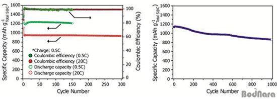 °³¹ßµÈ ¸®Æ¬È² ÀüÁö¼ö¸íƯ¼º ±×·¡ÇÁ, 300ȸÀÇ Ãæ¡¤¹æÀü ½Ã¿¡µµ Ãʱ⠿뷮ÀÇ 99.2%ÀÇ ¼º´ÉÀ» ³½´Ù.(ÁÂÃø) 1000ȸ Ãæ¡¤¹æÀü¿¡µµ ³ôÀº ¼º´ÉÀ» À¯ÁöÇÑ´Ù.(¿ìÃø)