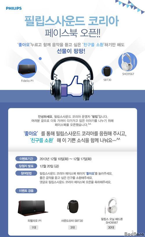 À̹ø À̺¥Æ®¿Í °ü·Ã µÈ º¸´Ù ÀÚ¼¼ÇÑ ³»¿ëÀº Çʸ³½º »ç¿îµåÁ¦Ç° °ø½Ä ÆäÀ̽ººÏ(https://www.facebook.com/philipssoundkorea)¿¡¼ È®ÀÎ °¡´ÉÇÏ´Ù.