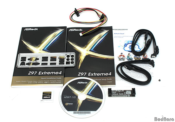 Á¦Ç° »ç¿ëÀ» À§ÇÑ ¾Ç¼¼¼¸®·Î´Â SLI Ä¿³ØÅÍ¿Í °¢Á¾ ¸Å´º¾ó, ¹éÆÐ³Î I/O º¸È£¸¦ À§ÇÑ ½Çµå¿Í µå¶óÀ̹ö ¹× À¯Æ¿¸®Æ¼, 4°³ÀÇ SATA ÄÉÀ̺í°ú HDD Saver ¿ë Àü¿ø ÄÉÀ̺í, M.2 SSD °íÁ¤¿ë ³ª»ç, ASRock Ŭ¶ó¿ìµå »ç¿ë ¼³¸í¼°¡ Á¦°øµÈ´Ù.