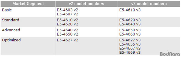 Á¦¿Â E5-4603 v2¿Í 4607 v2´Â ·Î¿ì¿£µå·Î Á¦¿Â E5-4610 v3·Î, ¹Ìµå·¹ÀÎÁö´Â E5-4620 v3¿Í E5-4640 v3°¡ µîÀå, ÇÏÀÌ¿£µå¿¡´Â E5-4650 v3¿Í E5-4660 v3ÀÇ 2Á¾ÀÌ °¢°¢ µîÀåÇÑ´Ù.