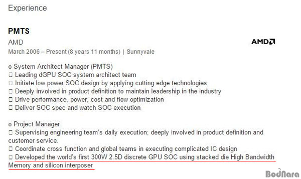 ÀÌ¿Í ÇÔ²² ¼¼°è ÃÖÃÊÀÇ 300W 2.5D GPU SoC HBM ¸Þ¸ð¸®¿Í ½Ç¸®ÄÜ ÀÎÅÍÆ÷Àú °³¹ß¿¡ Âü¿©Çß´Ù°í ¹àÈ÷°í Àִµ¥(Developed the world's first 300W 2.5D discrete GPU SOC using stacked die High Bandwidth Memory and silicon interposer), ÇöÀç±îÁö ¾Ë·ÁÁø ³»¿ë°ú °æ·ÂÀ» Á¾ÇÕÇϸé ÀÌ´Â ¶óµ¥¿Â R9 380X¸¦ ĪÇÏ´Â °ÍÀ¸·Î ºÐ¼®µÈ´Ù.
