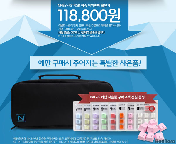À̹ø ¿¹¾à ÆÇ¸Å´Â 11¹ø°¡¿¡¼ 2016³â 3¿ù 1ÀϺÎÅÍ 3¿ù 6ÀÏ ±îÁö 6Àϰ£ ÁøÇàµÇ¸ç. 7ÀÏ Àϰý ¹è¼ÛµÉ ¿¹Á¤ÀÌ´Ù. ¿¹¾à ±¸¸Å ƯÀüÀ¸·Î ¿¹¾à ±¸¸ÅÀÚ Àü¿ø¿¡°Ô ‘NKEYBOARD BAG’ Űº¸µå°¡¹æ°ú ‘9KEY PBT ÀÌÁß»çÃâ Ä÷¯Å°Ä¸’À» ÁõÁ¤ÇÑ´Ù.
