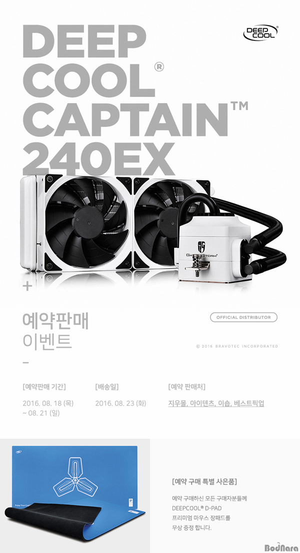 PC ÄÉÀ̽º, Ä𸵠½Ã½ºÅÛ, ÆÄ¿ö ¼ÇöóÀÌ, ÀÔ·Â ÀåÄ¡ ¹× ±âŸ ÁÖº¯±â±â Àü¹® ¾÷ü ¢ßºê¶óº¸ÅØ(http://bravotec.co.kr)¿¡¼ ½Å±Ô Ãâ½Ã ¿¹Á¤ÀÎ DEEPCOOL GAMER STORM CAPTAIN 240EX WHITE ¼ö·© Äð·¯ÀÇ »çÀü ¿¹¾à ÆÇ¸Å¸¦ ÁøÇàÇÑ´Ù°í ¹àÇû´Ù.