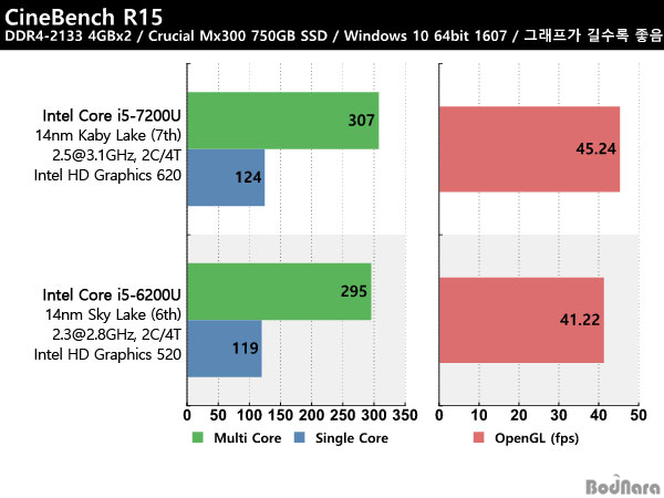 i5-6200U´Â CPU µ¿ÀÛ Å¬·°¿¡ µû¸¥ Á¤µµÀÇ ¼º´É Â÷À̸¦ º¸¿©ÁÖ´Â °ÍÀ» È®ÀÎÇÒ ¼ö ÀÖ´Ù. GPU(OpenGL) ¼º´É¿¡¼µµ 10% Á¤µµÀÇ