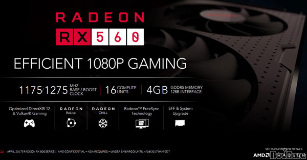 AMDÀÇ ¹ßÇ¥¿¡ µû¸£¸é ¶óµ¥¿Â RX 560Àº Full HD e½ºÆ÷Ã÷ °ÔÀÓ Å¸ÀÌÆ² °ÔÀ̸Ӹ¦ °Ü³ÉÇÑ Á¦Ç°À¸·Î, Ÿ°ÙÃþÀ» °¨¾ÈÇßÀ» ¶§ ¿£ºñµð¾ÆÀÇ ÁöÆ÷½º GTX 1050(Ti)¿Í °æÀï ±¸µµ¸¦ Çü¼ºÇÒ °ÍÀ¸·Î Àü¸ÁµÈ´Ù.