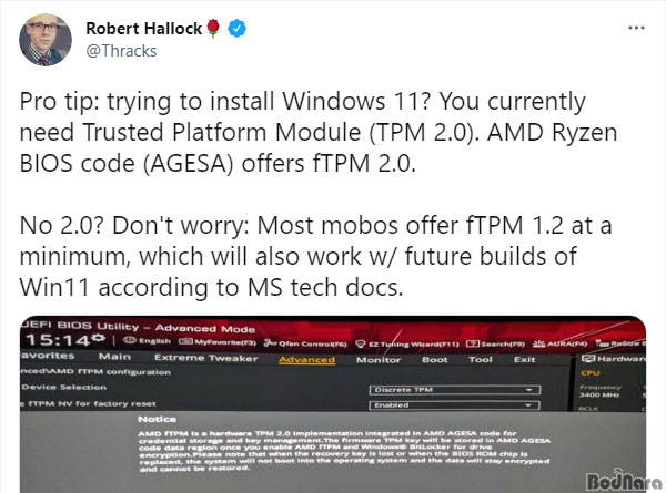 ÇÒ·Ï(Robert Hallock)¿¡ µû¸£¸é ÇâÈÄ À©µµ¿ì 11 ºôµå¿¡¼µµ fTPM 1.2 ¹öÀü°ú ȣȯµÇ¹Ç·Î, MS°¡ 1¼¼´ë