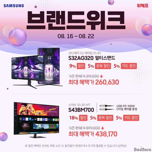 8¿ù 22ÀϱîÁö ÁøÇàµÇ´Â À̹ø Çà»ç´Â »ï¼º ¸ð´ÏÅÍ 7°³ ¸ðµ¨¿¡ ´ëÇØ ÇÒÀÎ ÇýÅÃÀ» ¹ÞÀ» ¼ö ÀÖÀ¸¸ç, ¿Àµð¼¼ÀÌ G3 S32AG320 ¸ÖƼ½ºÅĵå 32ÀÎÄ¡ °ÔÀÌ¹Ö ¸ð´ÏÅÍ / ½º¸¶Æ® M7 S43BM700 43ÀÎÄ¡ ¸ð´ÏÅÍ µî ´Ù¾çÇÑ ¸ðµ¨À» ÃÖ´ë 28% ÇÒÀÎµÈ °¡°ÝÀ¸·Î ±¸¸ÅÇÒ ¼ö ÀÖ´Ù.