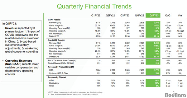 ƯÈ÷ ¾¾°ÔÀÌÆ® Á¦Ç° ¶óÀÎÀÇ 90% °¡·®À» Â÷ÁöÇϰí ÀÖ´Â HDD ¸ÅÃâÀÌ Å« ÆøÀ¸·Î Ç϶ôÇߴµ¥, 3ºÐ±â ¾¾°ÔÀÌÆ® HDD ¸ÅÃâ¾×Àº 17¾ï 7,200¸¸ ´Þ·¯·Î ÀüºÐ±â ´ëºñ 26%, Àü³â µ¿±â ´ëºñ 38%°¡ ÁÙ¾ú´Ù. ¹Ý¸é ½Ã½ºÅÛ, SSD ¹× ±âŸ ¸ÅÃâÀº 2¾ï 1,800¸¸ ´Þ·¯·Î ÀüºÐ±âº¸´Ù 21% Áõ°¡ÇßÀ¸³ª HDD ¸ÅÃâ Ç϶ôÀ» ¸Þ²Ü ¼öÁØÀº µÇÁö ¸øÇß´Ù.