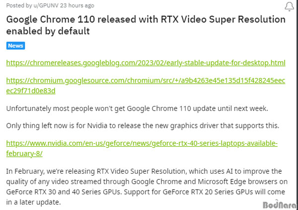 ÇÑÆí, Áö³ÇØ 12¿ù 15ÀÏ ¾÷µ¥ÀÌÆ®µÈ ±¸±Û±ê ÆäÀÌÁö¿¡ µû¸£¸é RTX ºñµð¿À ½´ÆÛ ·¹Á¹·ç¼Ç(NvidiaVpSuperResolution) ±â´ÉÀº ¿£ºñµð¾Æ Á¦¾îÆÇ¿¡¼ On/ OffÇÒ ¼ö ÀÖÁö¸¸ ±âº»ÀûÀ¸·Î OffµÇ¾î ÀÖ´Ù. Å©·Ò 110 ¹öÀü¼Àº ´ÙÀ½ ÁÖ ¹èÆ÷µÉ °ÍÀ¸·Î ¿¹»ó ÁßÀ̸ç, ¶§¸¦ °°ÀÌÇØ ¿£ºñµð¾Æµµ RTX ºñµð¿À ½´ÆÛ ·¹Á¹·ç¼Ç Áö¿ø µå¶óÀ̹ö¸¦ ¹èÆ÷ÇÒ °ÍÀ¸·Î ±â´ëµÈ´Ù.