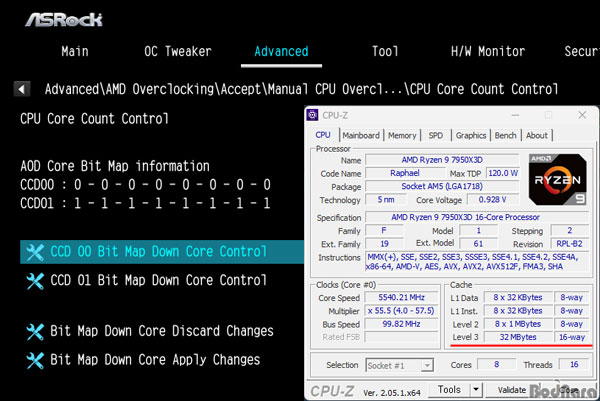 ¸ðµÎ '0(OFF)'À¸·Î ¼³Á¤Çϸé CPU-Z¼ L3 ij½Ã°¡ ±âº»Çü CCD¿¡ Æ÷ÇÔµÈ 32MB¸¸ Ç¥½ÃµÇ´Â °ÍÀ» º¼ ¼ö