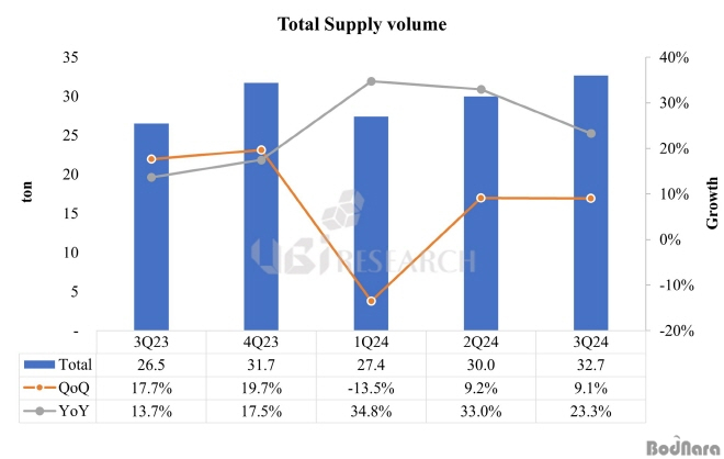 À¯ºñ¸®¼Ä¡ÀÇ ‘4Q24_Quarterly OLED Emitting Material Market Tracker’¿¡ µû¸£¸é 2024³â 3»çºÐ±â ¹ß±¤Àç·á ±¸¸Å·®ÀÌ 32.7 ÅæÀ¸·Î Áý°èµÇ¾ú´Ù. ±âÁ¸¿¡´Â Äڷγª 19 Ư¼ö·Î ½ÃÀåÀÌ È®´ëµÇ¾ú´ø 2021³â¿¡ Àç·á ±¸¸Å·®ÀÌ °¡Àå ³ô¾ÒÀ¸³ª, 2024³â 3ºÐ±â ¿ª´ë ÃÖ°íÁ¡À» ´Ù½Ã °»½ÅÇß´Ù. ¸Å³â 4»çºÐ±â¿¡ °¡Àå ³ôÀº »ç¿ë·®À» ³ªÅ¸³»´Â OLED ¹ß±¤Àç·áÀÇ Æ¯¼ºÀ» °í·ÁÇØºÃÀ» ¶§, 2024³âµµ´Â ¿ª´ë ÃÖ°íÀÇ »ç¿ë·®ÀÌ ³ªÅ¸³¯ °ÍÀ¸·Î Àü¸ÁµÈ´Ù.