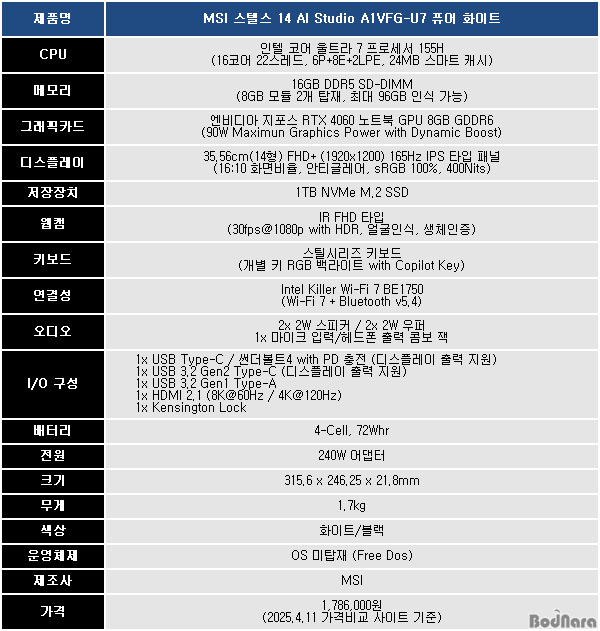 MSI ½ºÅÚ½º 14 AI Studio A1VFG-U7 Ç»¾î ÈÀÌÆ®¿¡ µé¾î°£ ÀÎÅÚ ÄÚ¾î ¿ïÆ®¶ó 7 ÇÁ·Î¼¼¼ 155H ¹× ¿£ºñµð¾Æ ÁöÆ÷½º