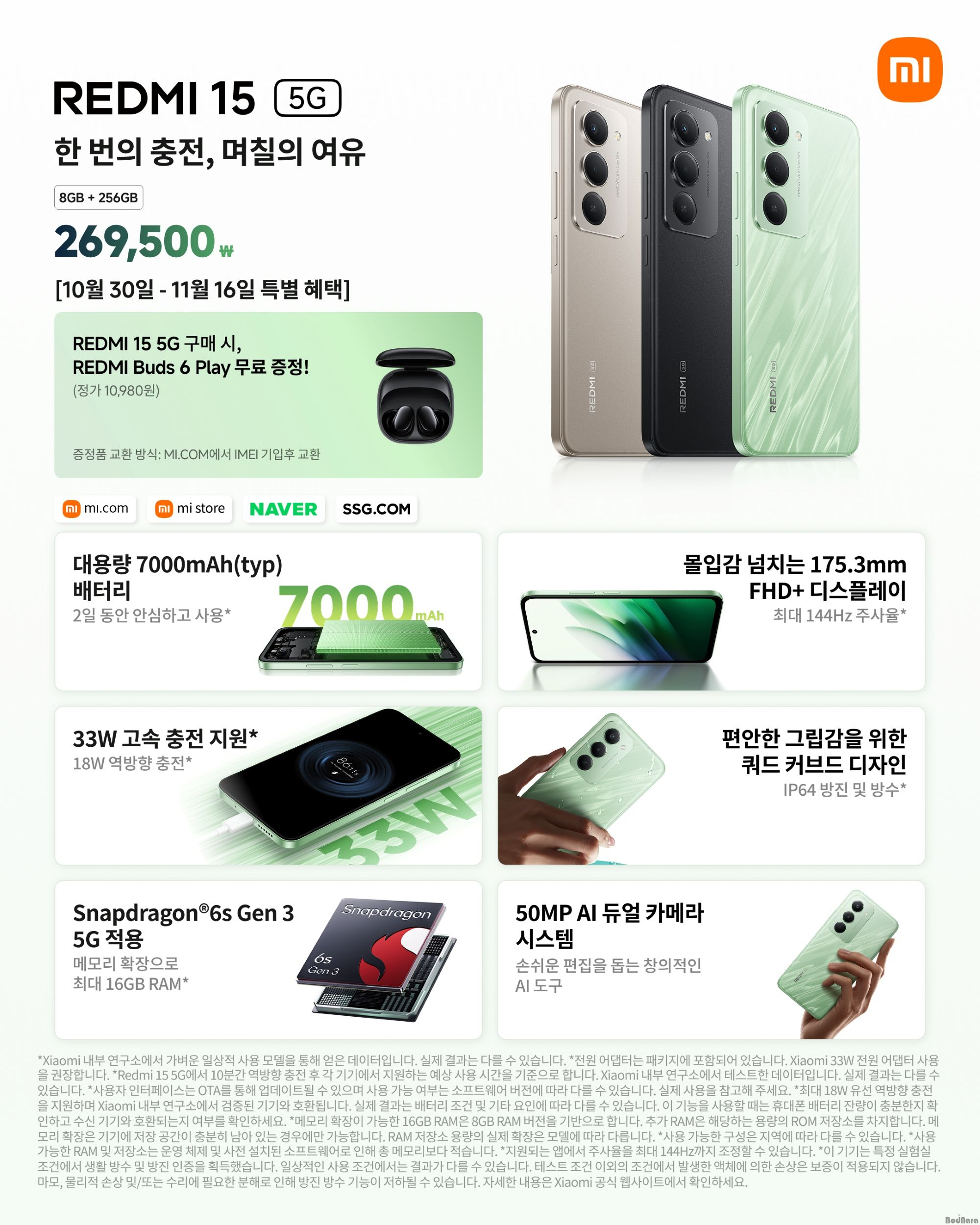 ‘·¹µå¹Ì 15 5G’¸¦ ±¸¸ÅÇÑ °í°´¿¡°Ô´Â ¹«¼± À̾îÆù ‘·¹µå¹Ì ¹öÁî 6 Ç÷¹ÀÌ(REDMI Buds 6 Play)’°¡ ¹«·á ÁõÁ¤µÈ´Ù. ÁõÁ¤Ç°Àº mi.com¿¡¼ Á¦Ç° ÀϷùøÈ£(SN, ÅÂºí¸´) ¶Ç´Â IMEI(½º¸¶Æ®Æù) Á¤º¸¸¦ ÀÔ·Â ÈÄ ±³È¯ÇÒ ¼ö ÀÖ´Ù.