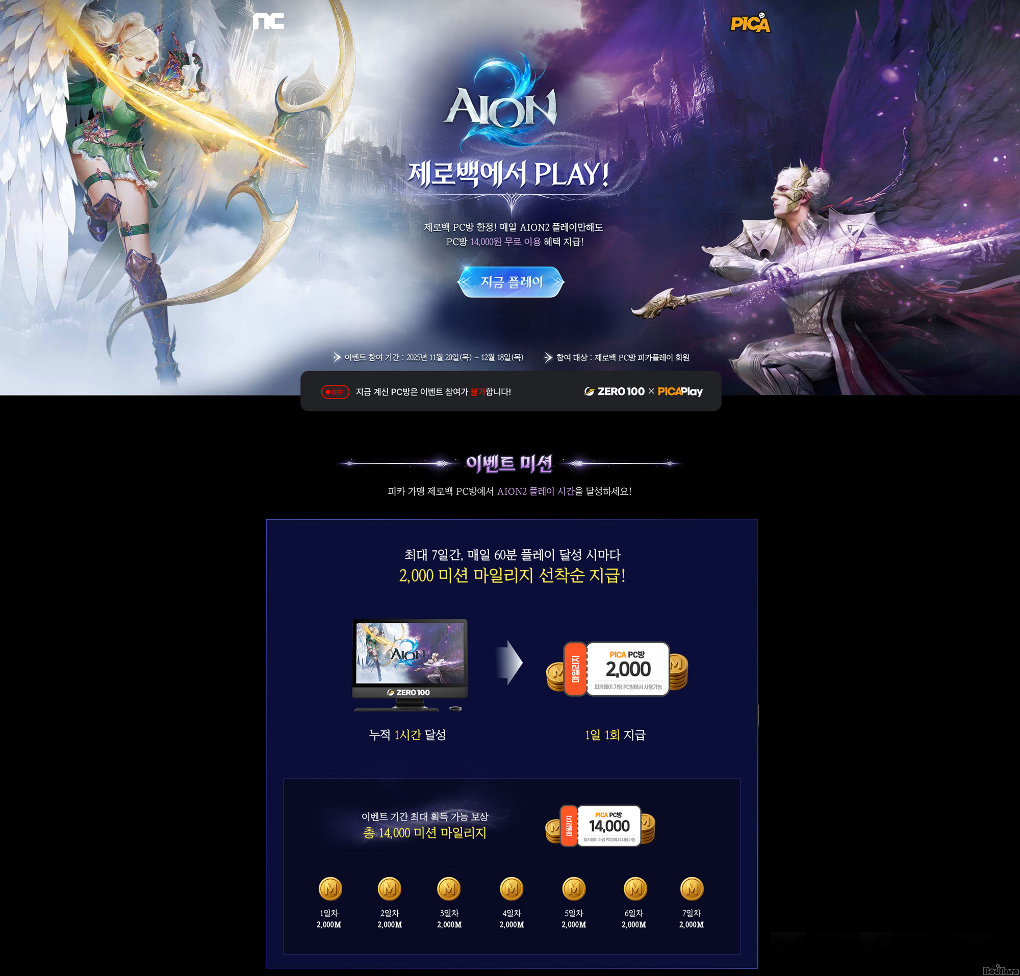 ¿Â¶óÀÎ À̺¥Æ®´Â 12¿ù 18ÀϱîÁö Àü±¹ Á¦·Î¹é PC¹æ 125°³ ¸ÅÀå¿¡¼ Âü¿© °¡´ÉÇϸç, PC¹æ¿¡¼ ¸ÅÀÏ ‘¾ÆÀÌ¿Â2’ 1½Ã°£ Ç÷¹ÀÌ ¹Ì¼Ç¸¸ ÇØµµ 2,000 ÇÇÄ« ¸¶Àϸ®Áö°¡ Áö±ÞµÇ¸ç ÃÖ´ë 14,000 ÇÇÄ« ¸¶Àϸ®Áö¸¦ ¹ÞÀ» ¼ö ÀÖ´Ù.