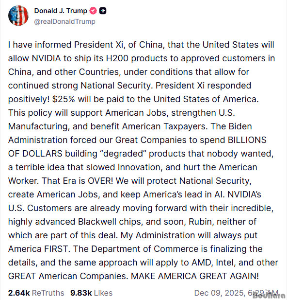 Æ®·³ÇÁ ´ëÅë·ÉÀº ÀÚ½ÅÀÇ SNS °èÁ¤À» ÅëÇØ Á÷Á¢ À̸¦ ¾ð±ÞÇÏ¿´´Âµ¥, ÀÌ´Â 2022³â ÀÌÈÄ °ÈµÅ ¿Â ¹Ì±¹ÀÇ AI ¹ÝµµÃ¼ ´ëÁß ¼öÃâ ±ÔÁ¦¸¦ »ç½Ç»ó ÀϺΠ¿ÏÈÇÏ´Â Á¶Ä¡·Î º¼ ¼ö ÀÖ´Ù. ´ÜÁö, ¿£ºñµð¾Æ ÃֽŠÁ¦Ç°ÀÎ ºí·¢À£ ½Ã¸®Áî ¹× Â÷¼¼´ë Á¦Ç°ÀÎ ·çºó ½Ã¸®Áî´Â ¿©ÀüÈ÷ ¼öÃâ Á¦ÇÑ ´ë»óÀ¸·Î À¯ÁöÇÑ´Ù.
