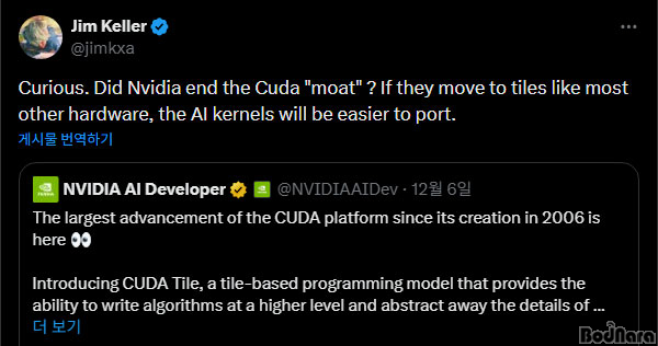 ´ÜÁö, Æ÷ÆÃÀº ´õ ½¬¿öÁú ¼ö ÀÖÁö¸¸ Tile IR°ú °°Àº CUDA TileÀÇ ±â¹ÝÀÌ µÇ´Â µ¶Á¡ ±â¼úÀÌ NVIDIA Çϵå¿þ¾î ½Ã¸Çƽ¿¡ ÃÖÀûȵǾî Àֱ⠶§¹®¿¡ ±Ã±ØÀûÀ¸·Î CUDA TileÀº NVIDIAÀÇ ÀÔÁö¸¦ °È ½ÃÄÑÁÙ °ÍÀ¸·Î Àü¸ÁµÈ´Ù.