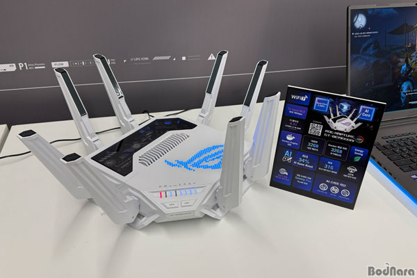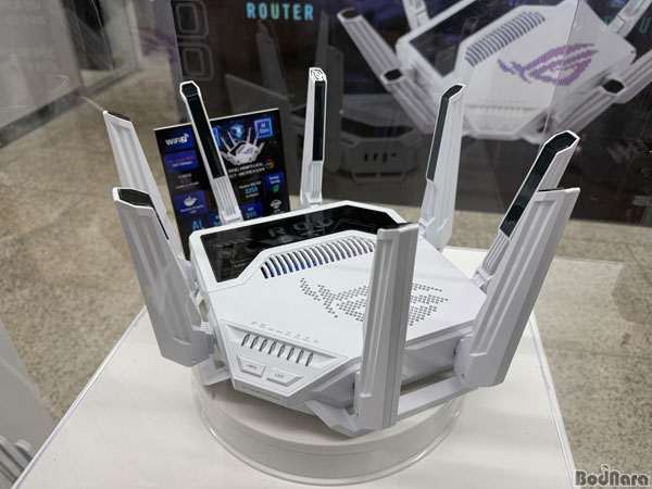 ÇöÀå¿¡¼ ÇÙ½ÉÀ¸·Î ¼Ò°³µÈ °øÀ¯±â´Â ‘ROG Rapture GT-BE19000AI’´Ù. 6GHz 11.52Gbps, 5GHz 5.764Gbps, 2.4GHz 1.376Gbps·Î ÅëÇÕ 19Gbps¸¦ Áö¿øÇÏ´Â °í¼º´É ¸ðµ¨·Î, 2.6GHz ÄõµåÄÚ¾î CPU ±â¹Ý ‘¶ó¿ìÅÍ ÄÚ¾î’ ¿Ü¿¡ 7.9TOPS±Þ NPU¸¦ ³»ÀåÇÑ ‘AI Äھ¦ º°µµ·Î žÀçÇÑ Á¡À» Àü¸é¿¡ ³»¼¼¿ü´Ù.