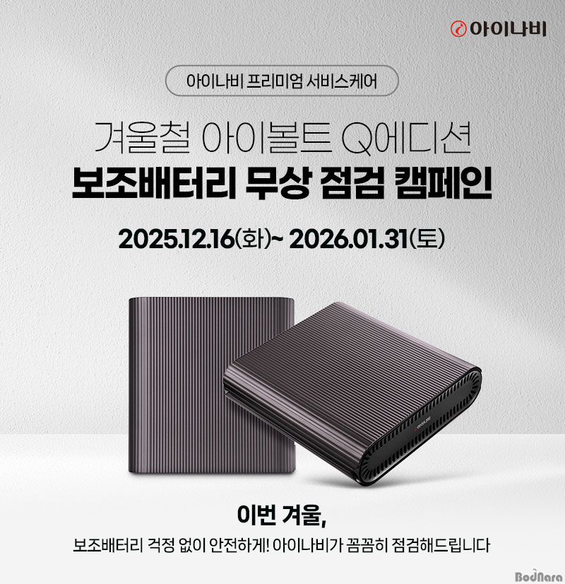 À̹ø Ä·ÆäÀÎÀº ±âÁ¸ ¾ÆÀ̺¼Æ® ‘BAB-120Q’, BAB-115Q’ º¸Á¶¹èÅ͸®¸¦ »ç¿ëÇÏ´Â °í°´À» ´ë»óÀ¸·Î Çϸç, °Ü¿ïö ¿Âµµ º¯È¿¡ µû¸¥ º¸Á¶º£Å͸® ¼º´É°ú ¾ÈÀü ¹®Á¦¸¦ ¿¹¹æÇϱâ À§ÇÑ ¹«»ó Á¡°Ë ¼ºñ½º¸¦ Á¦°øÇϴ Ưº° ÇÁ·Î±×·¥ÀÌ´Ù.