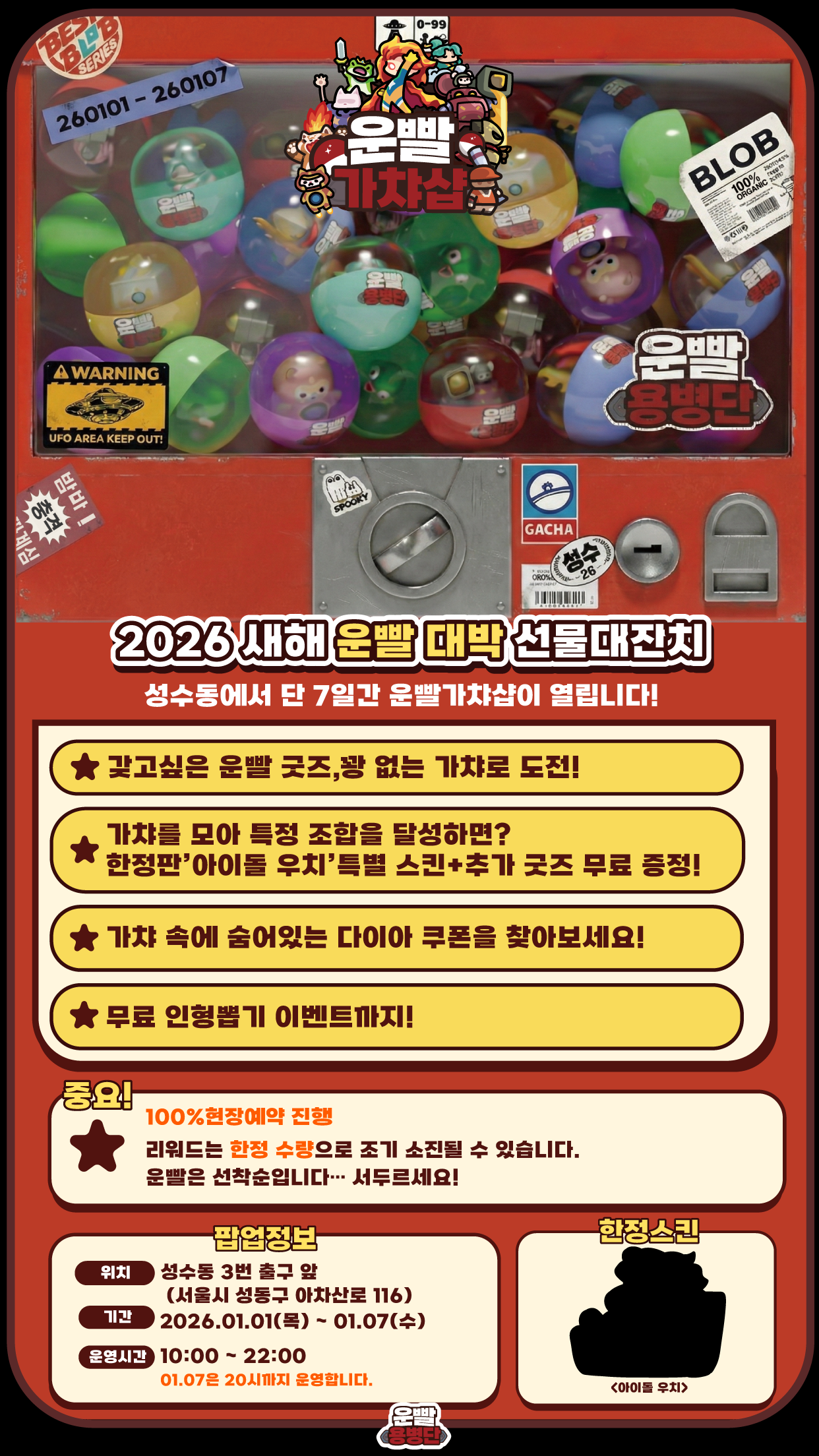 À̹ø ÆË¾÷Àº ‘¿î»¡ °¡Ã­¼¥’À» ÄܼÁÆ®·Î, °ÔÀÓ ³» Á¶ÇÕ ½Ã½ºÅÛÀ» Â÷¿ëÇØ ±ÂÁ ¸ðÀ¸°í Á¶ÇÕ °á°ú¿¡ µû¶ó Ãß°¡ º¸»óÀ» ȹµæÇÏ´Â ¿ÀÇÁ¶óÀΠüÇèÇü ÄÜÅÙÃ÷·Î ±¸¼ºµÆ´Ù. °¡Ã­¸¦ ÅëÇØ ¸ðÀº ±ÂÁ ƯÁ¤ Á¶ÇÕÀ¸·Î ¿Ï¼ºÇϸé, ÇÑÁ¤ÆÇ ‘¾ÆÀ̵¹ ¿ìÄ¡’ Ưº° ½ºÅ²°ú Ãß°¡ ±ÂÁî°¡ ¹«·á·Î ÁõÁ¤µÈ´Ù.