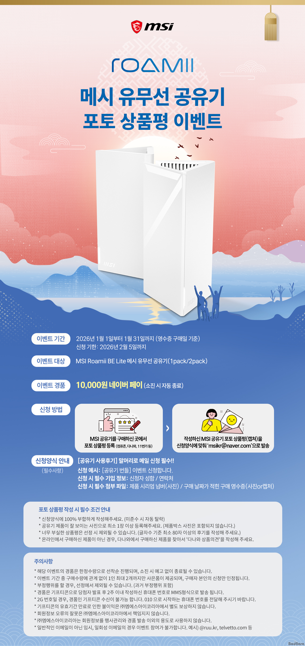 À̹ø À̺¥Æ®´Â 2026³â 1¿ù 1ÀϺÎÅÍ 1¿ù 31ÀϱîÁö MSI Roamii BE Lite WiFi 7 ¸Þ½Ã À¯¹«¼± °øÀ¯±â¸¦ ±¸¸ÅÇÑ °í°´ Áß, Á¦Ç° »ç¿ë Èı⸦ ÀÛ¼ºÇÑ °í°´À̶ó¸é ´©±¸³ª Âü¿©ÇÒ ¼ö ÀÖ´Ù. Âü¿© °í°´¿¡°Ô´Â ³×À̹öÆäÀÌ 1¸¸ ¿øÀÌ ¼±Âø¼øÀ¸·Î ÁõÁ¤µÇ¸ç, À̺¥Æ® ½ÅûÀº 2026³â 2¿ù 5ÀϱîÁö °¡´ÉÇÏ´Ù.