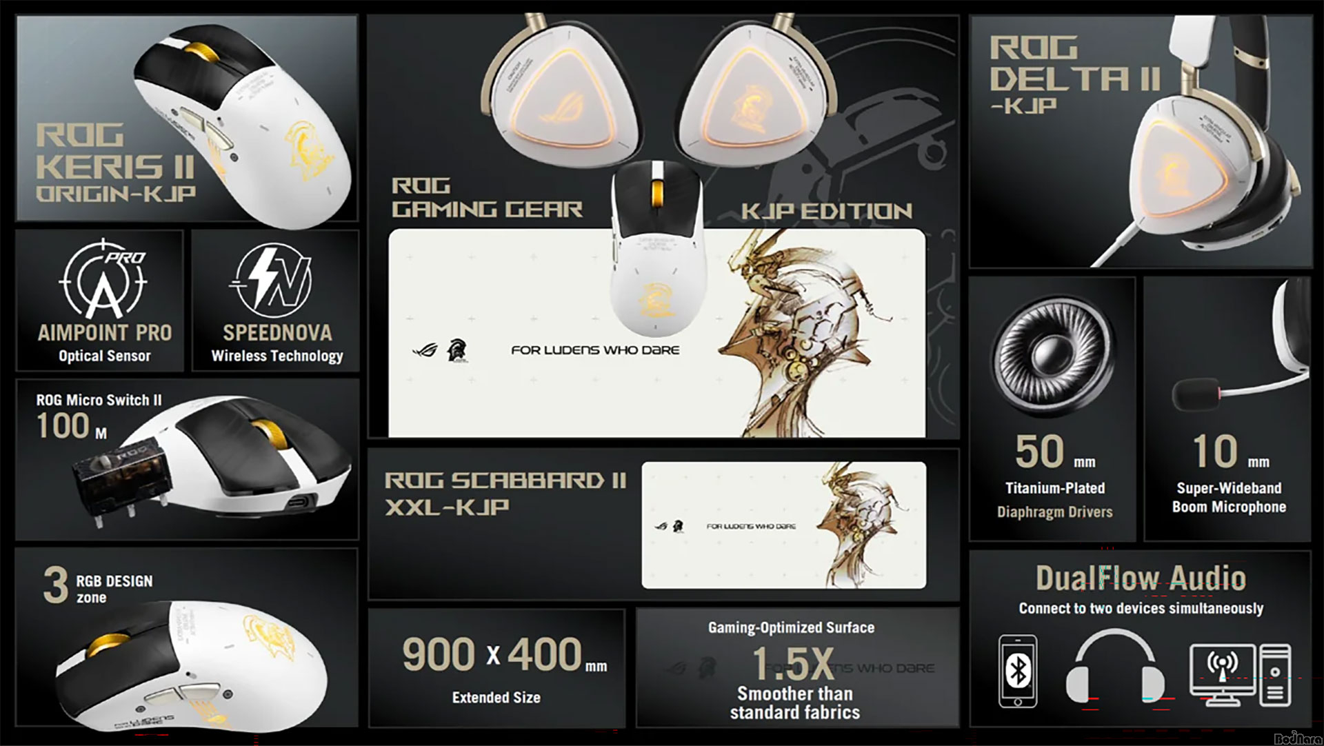 ROG Keris II Origin-KJP EditionÀº ±âÁ¸ Keris ¸¶¿ì½ºÀÇ 42,000dpi°í°¨µµ ¼¾¼¿Í 8,000HzÀÇ Æú¸µ·¹ÀÌÆ®¸¦ ÅëÇØ Á¤±³ÇÑ ÄÁÆ®·ÑÀ» Áö¿øÇϸç, 65gÀÇ °¡º¿î ¹«°Ô¿Í ÇÔ²² ÀÎü°øÇÐÀû ¼³°è¸¦ Àû¿ëÇß´Ù. ¿©±â¿¡ ÄÚÁö¸¶ ÇÁ·Î´ö¼ÇÀÇ °ñµå, ±×·¹ÀÌ, ÈÀÌÆ® Ä÷¯ Á¶ÇÕ°ú °í±Þ½º·¯¿î ºí·¢ ±×¸³½ºÆ¼Ä¿¸¦ ´õÇØ °·ÂÇÑ ¼º´É°ú µ¶Æ¯ÇÑ µðÀÚÀÎ ¾ÆÀ̵§Æ¼Æ¼¸¦ µ¿½Ã¿¡ ±¸ÇöÇß´Ù.