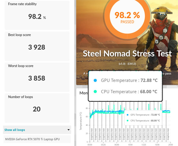Ä𸵠¼Ö·ç¼ÇÀÇ ¼º´ÉÀ» ¾Ë¾Æº¸±â À§ÇØ 3DMark Steel Nomad Stress Test¸¦ ÁøÇàÇßÀ¸¸ç, À̶§
