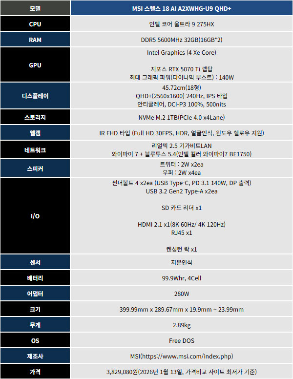 À̹ø ±â»ç¿¡¼´Â ¼º´É°ú ´ÙÀÚÀÎ, ±â´ÉÀ» ¸ðµÎ ¸¸Á· ½ÃÄÑÁÙ¸¸ÇÑ MSI ½ºÅÚ½º 18 HX AI A2XWHG-U9