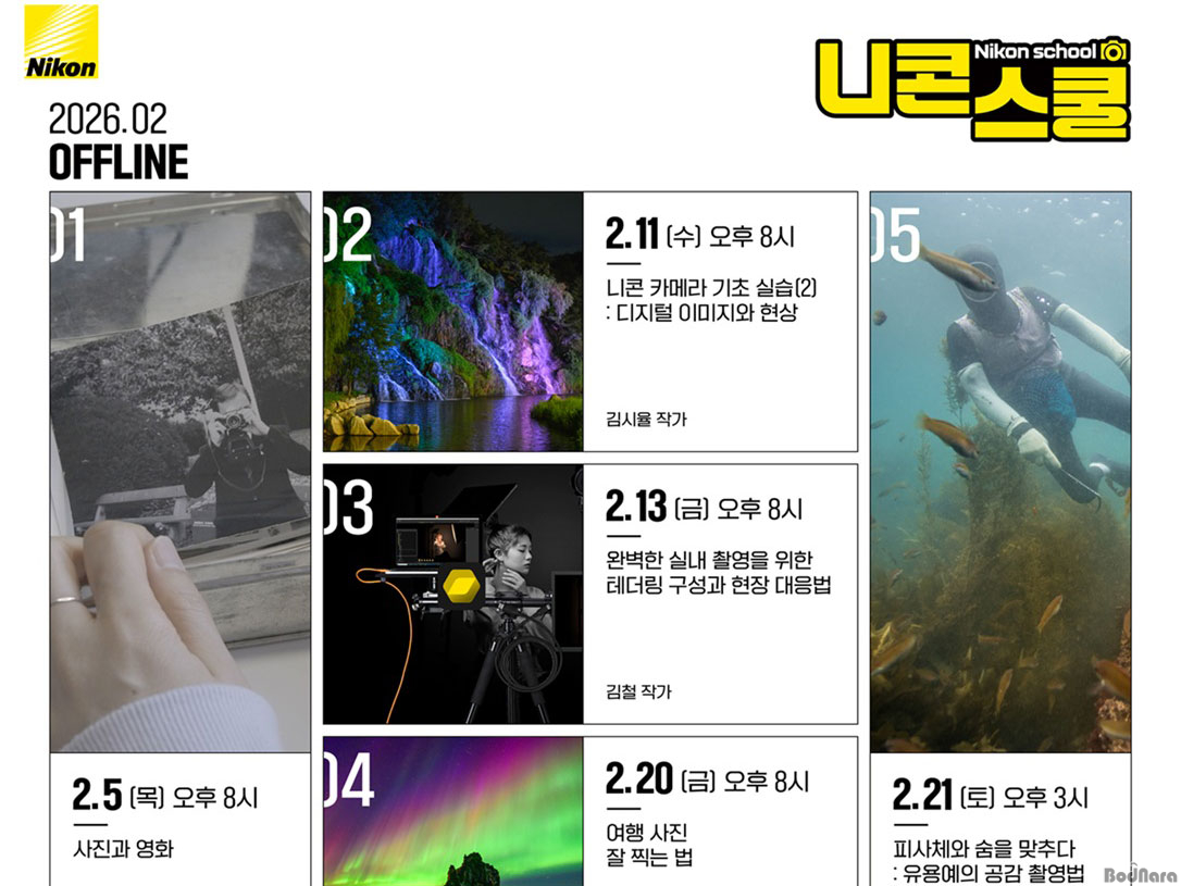 ¿Â¶óÀÎ °ÀÇ´Â ÃÑ 4°³ÀÇ °úÁ¤À¸·Î ±¸¼ºµÆ´Ù. 2¿ù 4ÀÏ¿¡´Â ÀÔ¹®ÀÚ¿ë ·»Áî ¼±Á¤ ¹æ¹ý°ú Ư¼ºÀ» ¼Ò°³ÇÏ´Â ‘ÀÔ¹® °¡ÀÌµå µÎ ¹øÂ°, À帣º° Ư¼º¿¡ ¸Â´Â ·»Áî ¼±Åðú Ȱ¿ë’ °Àǰ¡, 19ÀÏ¿¡´Â ‘NIKKOR Z 24-70mm f/2.8 S II¸¦ Ȱ¿ëÇÑ Àι° ÃÔ¿µÀÇ Âû³ªÀÇ ¼ø°£, ±íÀº °¨¼º’ °Àǰ¡ ¿¸°´Ù. À̾î, 23ÀÏ¿¡´Â ‘¾ß»ýµ¿¹° »çÁø º¸Á¤ÀÇ ÆÁ°ú ¿ä·É’, 25ÀÏ Àú³á 8½Ã º½ÀÇ ºÐÀ§±â¸¦ °¨¼ºÀûÀ¸·Î ´ã´Â ¹ýÀ» ¼³¸íÇÏ´Â ‘¸Å·ÂÀûÀÎ º½ »çÁø Àß Âï´Â ¹ý’ °Àǰ¡ ÁøÇàµÉ ¿¹Á¤ÀÌ´Ù.