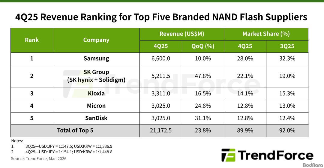 Æ®·£µåÆ÷½º(TrendForce)¿¡ µû¸£¸é 2025³â 4ºÐ±â »óÀ§ NAND °ø±Þ¾÷üµéÀÇ ÇÕ»ê ¸ÅÃâÀº ¾à 211¾ï 7õ¸¸ ´Þ·¯·Î Áý°èµÆÀ¸¸ç, ÀÌ´Â Àü ºÐ±â ´ëºñ ¾à 23.8% Áõ°¡ÇÑ ¼öÁØÀÌ´Ù.