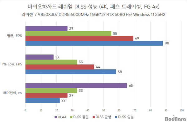 »óÅ¿¡¼µµ DLAA ¿É¼Ç¿¡¼´Â ¼º´É Çâ»óÀ» ±â´ëÇÒ ¼ö ¾ø´Ù. ±×¿¡ ¹ÝÇØ ³»ºÎ ·»´õ¸µ ÇØ»óµµ°¡ Á¡Â÷ ÁÙ¾îµå´Â DLSS ǰÁú/