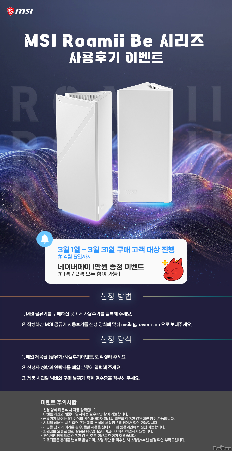 À̹ø À̺¥Æ®´Â 2026³â 3¿ù 1ÀϺÎÅÍ 3¿ù 31ÀϱîÁö MSI Roamii BE Lite ¶Ç´Â BE Pro¸¦ ±¸¸ÅÇÑ °í°´À̶ó¸é ´©±¸³ª Âü¿© °¡´ÉÇϸç, »ç¿ë Èı⸦ ÀÛ¼ºÇÑ ¼±Âø¼ø °í°´¿¡°Ô ³×À̹öÆäÀÌ 1¸¸ ¿øÀ» ÁõÁ¤ÇÑ´Ù. À̺¥Æ® ½ÅûÀº 2026³â 4¿ù 5ÀϱîÁö Á¢¼ö °¡´ÉÇÏ´Ù.