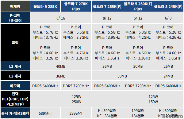 285K¿Í µ¿ÀÏÇØÁ³À¸¸ç, ÄÚ¾î ¿ïÆ®¶ó 5 250K(F) Plus´Â ÄÚ¾î ¿ïÆ®¶ó 7 265K(F)¿Í µ¿ÀÏÇÑ E-ÄÚ¾î¿Í 2°³
