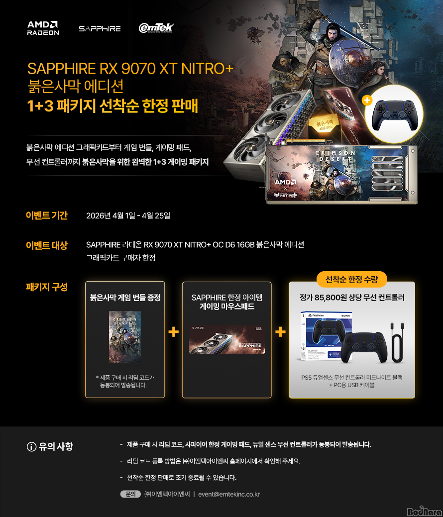 À̹ø ÇÁ·Î¸ð¼ÇÀº ‘SAPPHIRE ¶óµ¥¿Â RX 9070 XT NITRO+ OC D6 16GB ºÓÀº»ç¸· ¿¡µð¼Ç’ ±¸¸Å °í°´À» ´ë»óÀ¸·Î ¡ãºÓÀº»ç¸· °ÔÀÓ ÄÚµå ¡ãPS5 µà¾ó¼¾½º ¹«¼± ÄÁÆ®·Ñ·¯(PC¿ë USB ÄÉÀÌºí Æ÷ÇÔ) ¡ãSAPPHIRE °ÔÀÌ¹Ö ¸¶¿ì½ºÆÐµå¸¦ Á¦°øÇÏ´Â 1+3 ¹øµé ÆÐŰÁö·Î ±¸¼ºµÈ´Ù.