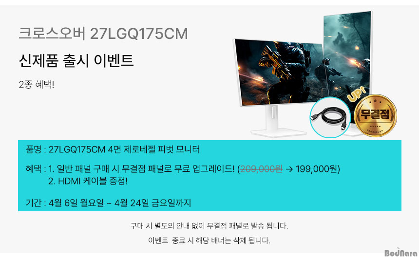 ¸ðµç ¿ÀǸ¶ÄÏÀ» ´ë»óÀ¸·Î 4¿ù 6ÀÏ(¿ù) ~ 4¿ù 24ÀÏ(ÀÏ)±îÁö ¾à 19Àϰ£ ÁøÇàµÇ´Â À̹ø Ãâ½Ã±â³ä Çà»ç¿¡¼ 27LGQ175CM ¸ð´ÏÅÍ ÀϹݸðµ¨À» ±¸ÀÔÇÏ¸é ¹«°áÁ¡ ¸ðµ¨·Î ¾÷±×·¹ÀÌµå µÅ¼ Ãâ°íµÈ´Ù. °í°´ÀÇ ºÎ´ãÀ» ´ú±â À§ÇØ ¹è¼Ûºñ´Â ¹«·á´Ù. ¶ÇÇÑ Çà»ç ±¸¸ÅÀοø ÇÑÁ¤À¸·Î °í±Þ HDMI ÄÉÀ̺íÀ» Ãß°¡·Î ÁõÁ¤ÇÑ´Ù.