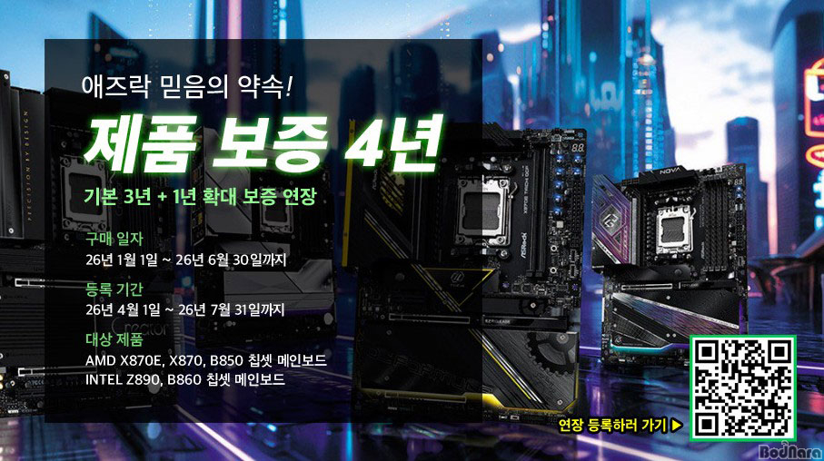 º¸Áõ ¿¬Àå ´ë»ó Á¦Ç°Àº ¾ÖÁî¶ô ¸ÞÀκ¸µå °¡¿îµ¥ ¡ãÀÎÅÚ B860·Z890 Ĩ¼Â ¸ÞÀκ¸µå, ¡ãAMD B850·X870·X870E Ĩ¼Â ¸ÞÀκ¸µå·Î ÇÑÁ¤µÈ´Ù. ´Ü, ¼¹öº¸µå¿Í ¿öÅ©½ºÅ×ÀÌ¼Ç º¸µå, ¸®ÆÛºñ½Ã Á¦Ç° ¹× Áß°í Á¦Ç°Àº Çà»ç ´ë»ó¿¡¼ Á¦¿ÜµÈ´Ù. Á¦Ç° µî·Ï °¡´É ±â°£Àº 2026³â 4¿ù 1ÀϺÎÅÍ 2026³â 7¿ù 31ÀϱîÁö´Ù.