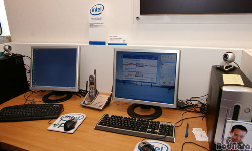 ºÎ½º ÀÔ±¸¿¡ µé¾î¼¸é º¸ÀÌ´Â °ÍÀÌ ¹Ù·Î Conroe ÄÚ¾î ±â¹Ý Core 2 Duo ÇÁ·Î¼¼¼°¡ µé¾î°£ ÀÎÅÚÀÇ µ¥½ºÅ©Å¾ µ¥¸ð ½Ã½ºÅÛÀÌ´Ù. ÇÊÀÚ°¡ Æ÷Åä ´º½º¿¡¼µµ ¿Ã¸° ÀûÀÌ ÀÖ´Â ÀÌ ½Ã½ºÅÛÀº Äð·¯ÀÇ ÆÒÀ» ÄÑ°í ²ø ¼ö ÀÖ´Â ½ºÀ§Ä¡¸¦ ´Þ¾Æ³õ°í °ü¶÷°´µé¿¡°Ô ÆÒÀ» Á¤Áö½ÃÄѵµ È÷Æ®½ÌÅ©¸¸À¸·Î ÃæºÐÈ÷ Ç®·Îµå ÀÛ¾÷À» ¼öÇàÇÒ ¼ö ÀÖ´Ù°í È«º¸Çϰí ÀÖ´Ù.