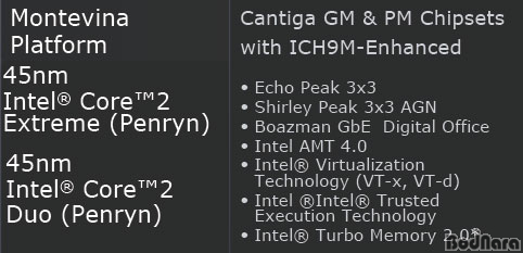 ÄÚµå¸í ¸óÅ׺ñ³ª´Â ÇöÀç ÆÇ¸ÅµÇ´Â ÀÎÅÚÀÇ ÃֽŠ³ëÆ®ºÏ Ç÷§ÆûÀÎ '»êŸ·Î»ç ¸®ÇÁ·¹½Ã(Santarosa Refresh)'¸¦ ´ëüÇÏ´Â »õ·Î¿î Ç÷§ÆûÀ̶ó´Â µ¥¿¡ ¸¹Àº À̸ñÀÌ ÁýÁßµÈ °ÍÀÌ »ç½ÇÀÌ´Ù. ¸óÅ׺ñ³ª Ç÷§ÆûÀº 45nm °øÁ¤À» »ç¿ëÇÏ´Â FSB 1066MHzÀÇ Ææ¸° ÇÁ·Î¼¼¼¸¦ »ç¿ëÇÑ´Ù´Â °Í ¿Ü¿¡µµ 965 ¸ð¹ÙÀÏ¿ë Ĩ¼ÂÀ» ´ëüÇÒ 4½Ã¸®Áî Ĩ¼Â GM/PM45 ¹× GM47 ³ë½ººê¸´Áö(ÄÚµå¸í ÄÆ¼°¡(Cantiga))¿Í ICH9-M »ç¿ì½º ºê¸´Áö¿Í ´õºí¾î ¸ð¹ÙÀÏ ¿ÍÀ̸ƽº(WiMAX)¿Í °áÇÕµÈ »õ·Î¿î ¹«¼± ÀÌ´õ³Ý '¿¡ÄÚÇÇÅ©(Echo Peak 3x3)' ȤÀº '¼È¸®ÇÇÅ©(Shirley Peak 3x3 AGN)'ÀÌ ÇÔ²²ÇÑ ³»¿ëÀ» ´ã°í ÀÖ´Ù. (Âü°í ±â»ç 'ÇÑ´«¿¡ ¾Ë¾Æº¸´Â ¼¾Æ®¸®³ë ³ëÆ®ºÏ Ç÷§Æû º¯Ãµ»ç')