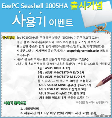 ¶ÇÇÑ , ±âÁ¸ ±¸¸Å °í°´À» Æ÷ÇÔÇØ¼ ±¸¸Å °í°´À» ´ë»óÀ¸·Î 10 ¿ù 20 ÀϱîÁö »ç¿ë Èıâ À̺¥Æ®¸¦ ÁøÇà Çϸç, °æÇ°À¸·Î EeePC 1005HA¿Í ASUS ÃֽЏ¶´õº¸µå, °øÀ¯±â, ¿ÜÀåÇϵå, USB ¸Þ¸ð¸®, ASUS Ä𷯵îÀÌ ÁغñµÇ¾î ÀÖ´Ù.