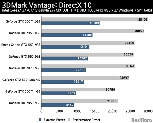 Á¦³í GTX 660 Æ®À©ÄðÀÇ ¼º´ÉÀº ¾î´À Á¤µµ ¼öÁØÀÎÁö È®ÀÎÇØº¸±â À§ÇØ ´ÙÀÌ·ºÆ®X 10 ȯ°æ ±â¹Ý º¥Ä¡¸¶Å© ÇÁ·Î±×·¥ÀÎ 3DMark Vantage·Î Å×½ºÆ®¸¦ ½Ç½ÃÇØº¸¾Ò´Ù.