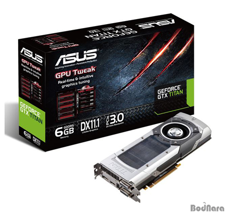 ASUS GTX TITAN 6GB ±×·¡ÇÈÄ«µå´Â ÃÖ´ë 876MHz±îÁö ºÎ½ºÆ®µÇ´Â NVIDIA ÁöÆ÷½º GTX TITAN GPU, 6GBÀÇ GDDR5 ¸Þ¸ð¸® ±×¸®°í ¾Ë·ç¹Ì´½ ÇϿ조ú Vapor Chamber ±â¼úÀÌ Á¢¸ñµÈ Ä𸵠½Ã½ºÅÛ, ASUS GPU Tweak±â´ÉÀ» Á¦°øÇÑ´Ù.