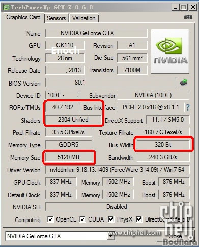 ´Ù¸¸ Äí´Ù ÄÚ¾î´Â ÀÌÀü¿¡ °ø°³µÈ 2496º¸´Ù ÁÙ¾îµç 2304·Î Ç¥±âµÇ¾î Â÷À̰¡ ÀÖÀ¸¸ç ³ª¸ÓÁö´Â ÀÌÀü¿¡ °ø°³ÇÑ ³»¿ë°ú À¯»çÇÑ °ÍÀ¸·Î È®ÀεȴÙ. ¸Þ¸ð¸®´Â GDDR5 5120MB, 320bit ¸Þ¸ð¸® ¹ö½º, ÄÚ¾î 837MHz, ¸Þ¸ð¸® 6008 (1502)MHz, GPU ºÎ½ºÆ® Ŭ·°Àº 876MHz´Ù.
